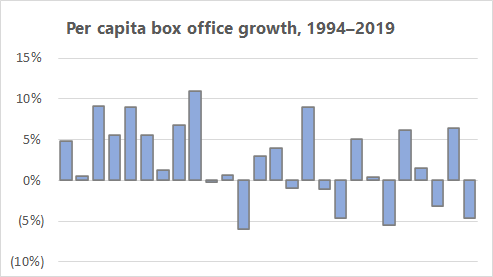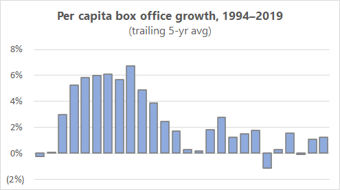 How do we know that we were approaching another transition? Let’s revisit that 25-year box office trend from the first section. We can start by stripping out population growth…