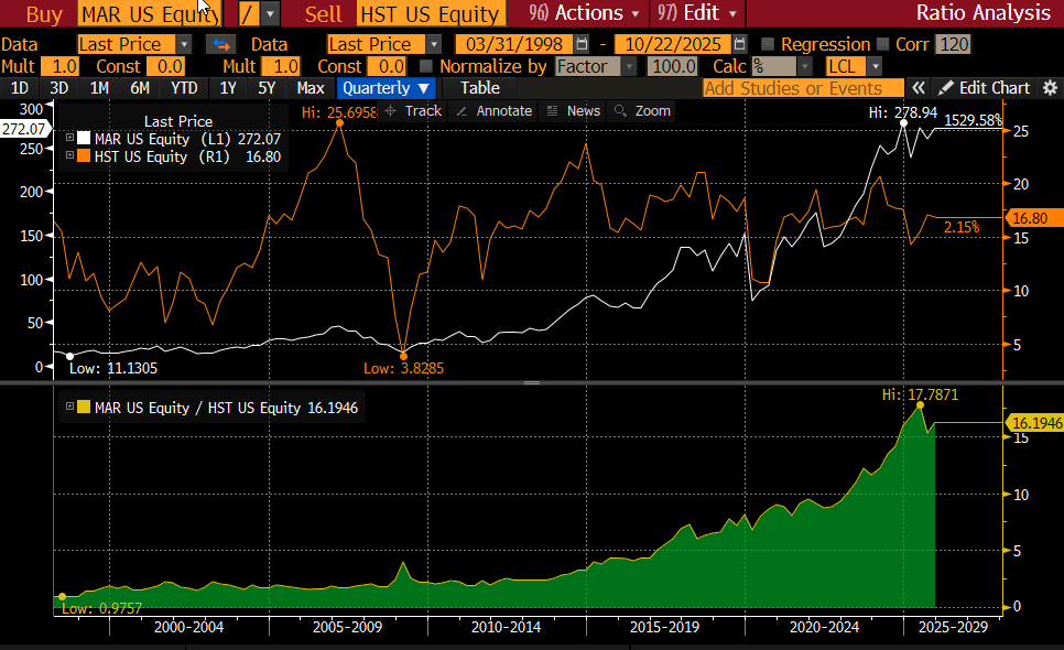 I used to joke that Marriott invented the modern hotel REIT to be the cheapest part of their capital stack, but it's barely even a joke. After almost three decades, MAR has outperformed their own REIT spinoff by a staggering 1500%, or almost 10% annually: